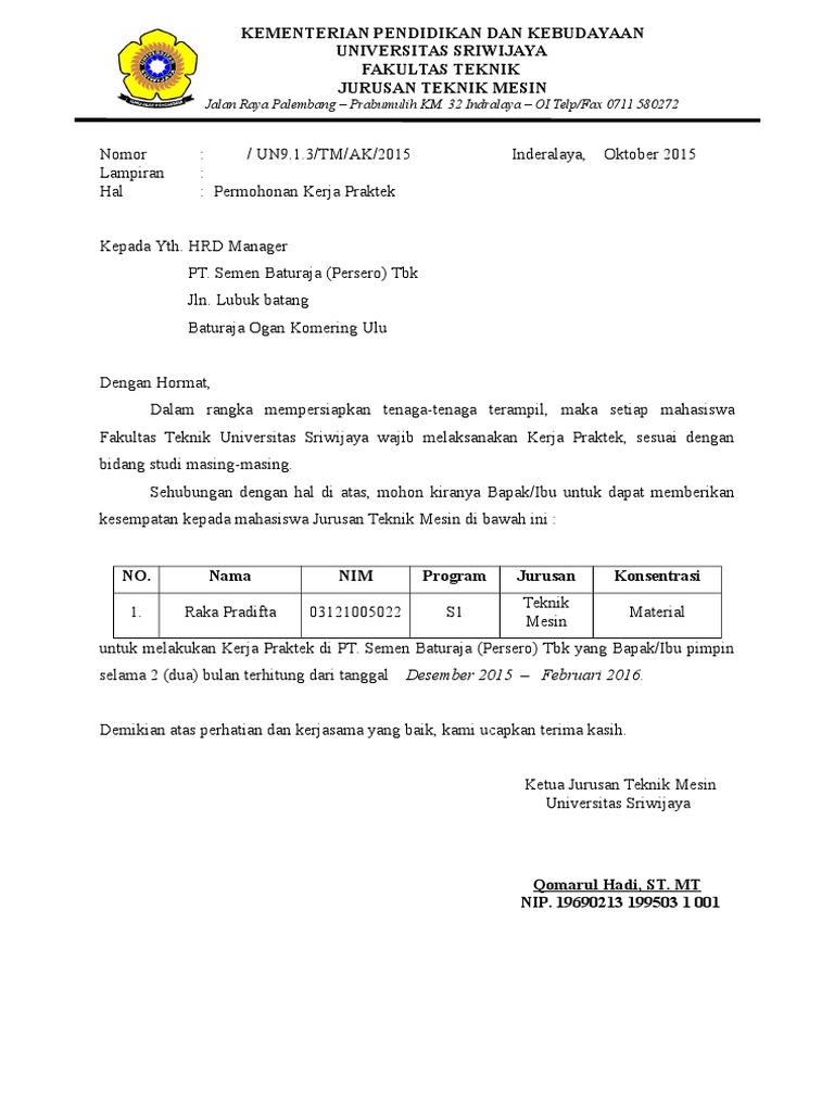1 satu berkas yth direktur program diploma iii fakultas teknik universitas syiah kuala darussalam banda aceh dengan hormat saya yang bertanda tangan dibawah ini. Kerja praktek kp atau sering juga disebut magang adalah mata kuliah yang terdapat di jurusan teknik. Dengan hormat berdasarkan info yang saya dapatkan dari media online bahwa perusahaan yang bapakibu kelola sedang membutuhkan karyawan dengan posisi it juniordengan ini saya mengajukan surat permohonan untuk bekerja pada posisi yang dimaksud. Contoh surat permohonan kerja praktek kp hal. Saat memasuki dunia perkuliahan sudah pasti ada saatnya bahwa anda harus melakukan praktek kerja yang dinamakan dengan kp. Energi listrik sebagai bahan pertimbangan bapakibu turut.