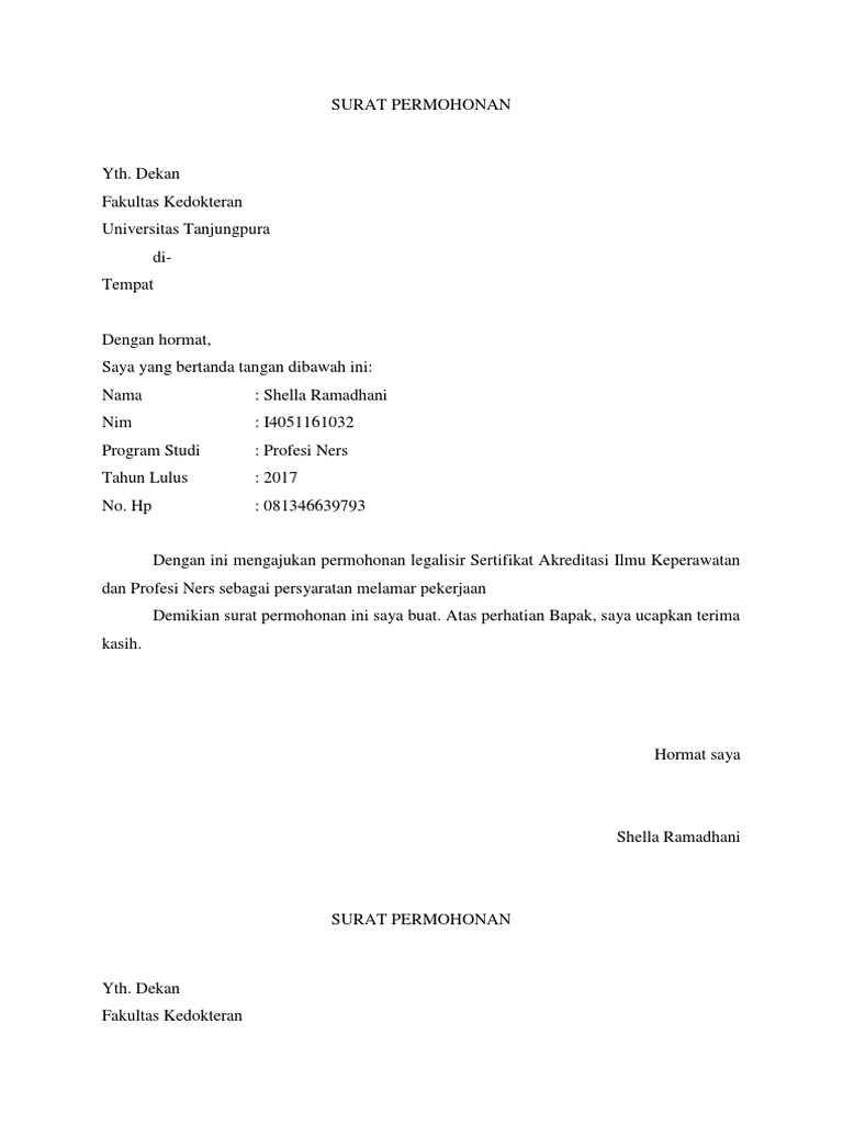 Contoh surat permohonan legalisir dokumen. Berikut adalah detail contoh surat permohonan legalisir dalam bahasa inggris. Foto copy surat hanya boleh dilegalisir di tempat surat itu dikeluarkan pertama kali contoh surat nikah hanya boleh dilegalisir oleh kua tempat pasangan menikah. Contoh surat permohonan legalisir kop surat kantor tercantum alamat dan nomor telepon kantor coret yang tidak perlu. Walaupun anda menamatkan pendidikan sarjana namun jika tidak memegang ijazah maka. Contoh surat rasmi permohonan cuti contoh surat rasmi permohonan keluar asrama contoh surat rasmi permohonan lampu jalan contoh surat rasmi permohonan permit contoh surat rasmi permohonan bantuan contoh surat rasmi permohonan pertukaran tempat kerja contoh surat rasmi permohonan sumbangan kewangan contoh surat rasmi permohonan tanah kerajaan contoh surat rasmi tidak hadir ke sekolah. Contoh surat resmi dalam bahasa inggris seiring dengan p.