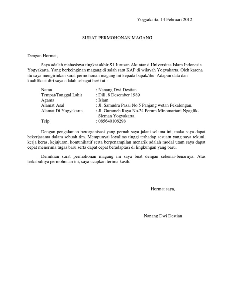 Selain perlu membuat surat permohonan magang yang menunjukkan bahwa kamu memang tertarik untuk melakukan kerja praktik di. Maju terus pantang mundur jalan mataram 123 sleman yogyakarta. Pada umumnya para mahasiswa tingkat akhir harus menyelesaikan kerja magang terlebih dahulu sebelum menamatkan atau menyelesaikan pendidikan dari universitas tertentu ataupun dari kampus tertentu. Tujuannya mahasiswa bisa belajar tentang dunia kerja sesuai dengan jurusan atau konsentrasi studi yang dipilihnya. Nama kampus mengajukan permohonan kepada bapakibu pimpinan agar dapat. Dengan hormat saya yang bertanda tangan di bawah ini.