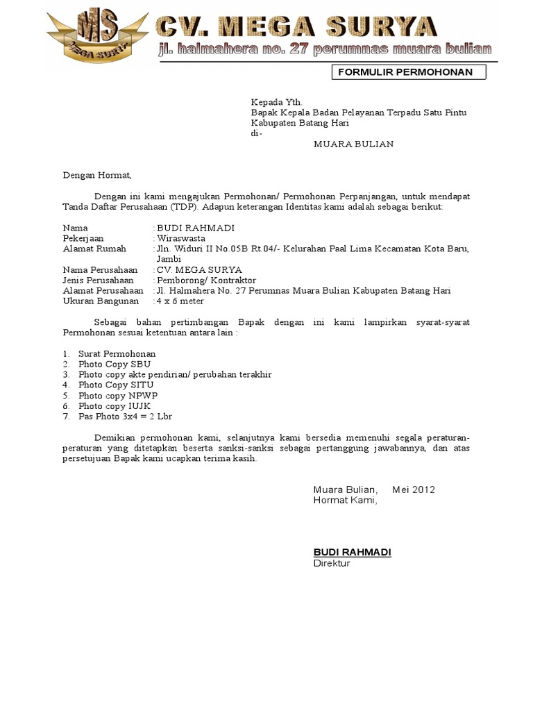 Nama pemilik perusahaan nama perusahaan bentuk perusahaan perubahan alamat kegiatan usaha pokok dan anggaran dasar pt. Contoh surat tanda daftar perusahaan tdp. Contoh surat permohonan siup bekasi. Sppl atau izin lingkungan bagi kegiatan usaha yang wajid dokumen ukl upl dan atau amdal. Tetapi untuk memperoleh sebuah usaha yg terpercaya dan memiliki pelanggan anda harus memiliki izin. Sudahkah mengenal dan memahami kegunaan keduanya.