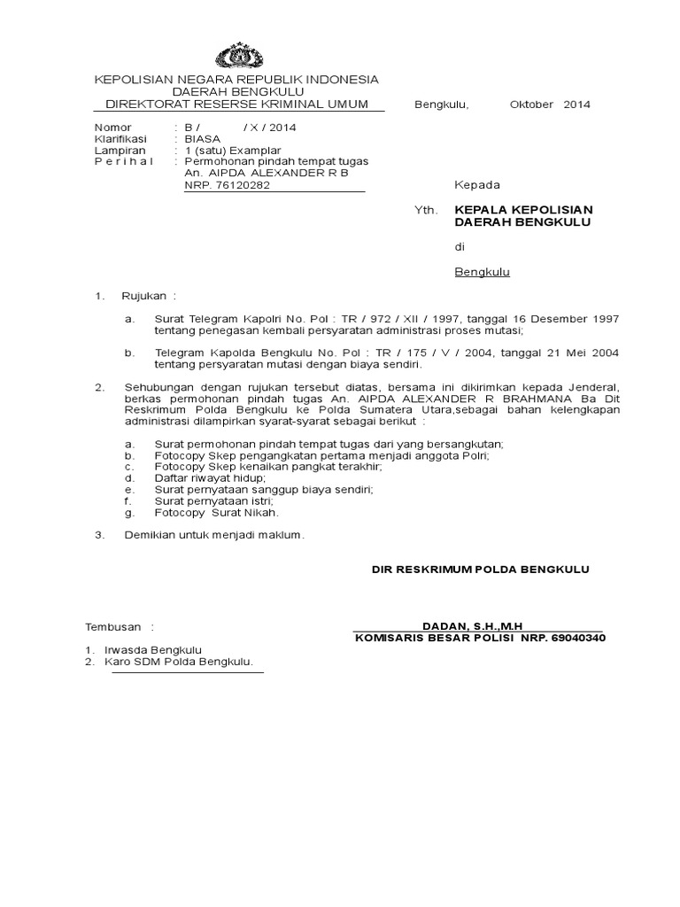 Contoh surat permohonan pindah tugas polri. Berkas pindah antar polda contoh program kerja supervisi akademik kepala sekolah. Admin blog bagi contoh surat 2019 juga mengumpulkan gambar gambar lainnya terkait contoh surat permohonan pindah tugas polri antar polres dibawah ini. 5 contoh surat keterangan pindah sekolah dan permohonan pindah terbaru. Contoh surat permohonan mutasi pindah tugas pns pada kesempatan ini akan mendistribusikan contoh surat lamaran tepatnya contoh surat permohonan mutasi kerja surat aplikasi mutasi ini berlaku untuk kepentingan umum pegawai negeri pegawai bank guru dan pegawai swasta. Demikianlah beberapa contoh surat permohonan mutasi atau pindah tugas kerja pns. Bagaimana cara mengecek sertifikat tanah di bpn.