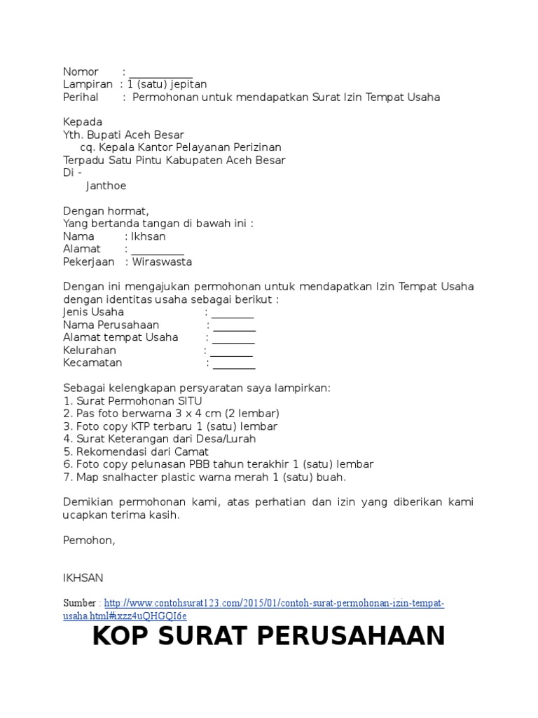 Contoh surat permohonan dalam kehidupan sehari hari sering kali kita dihadapkan dengan suatu situasi yang tidak dapat dikerjakan dengan sendiri dan harus memerlukan bantuan pertolongan dari orang lainagar permohonan tersebut dikabulkan maka kita harus membuat sebuah surat permohonan yang ditujukan kepada pihak yang bersangkutan. Dibeberapa lokasi di pemukiman biasanya memiliki sebuah tempat yang lebar seperti tanah lapang aula desa. Contoh surat izin gangguan yang baik dan benar untuk pendirian tempat usaha sebagai referensi pembuatan surat resmi yang dapat diunduh secara gratis dan lengkap. Surat izin usaha tersebut kita kenal dengan siup surat ijin usaha perdagangan yang merupakan suatu surat izin untuk mendirikan usaha di tempat tempat yang harus mendapatkan persetujuan secara resmi dari pemerintah daerah. Yang bertanda tangan. Contoh surat permohonan tempat usaha perdagangan setiap usaha yang legal haruslah memiliki surat izin perdagangan yang disahkan dilegalkan oleh pemerintah setempat.
