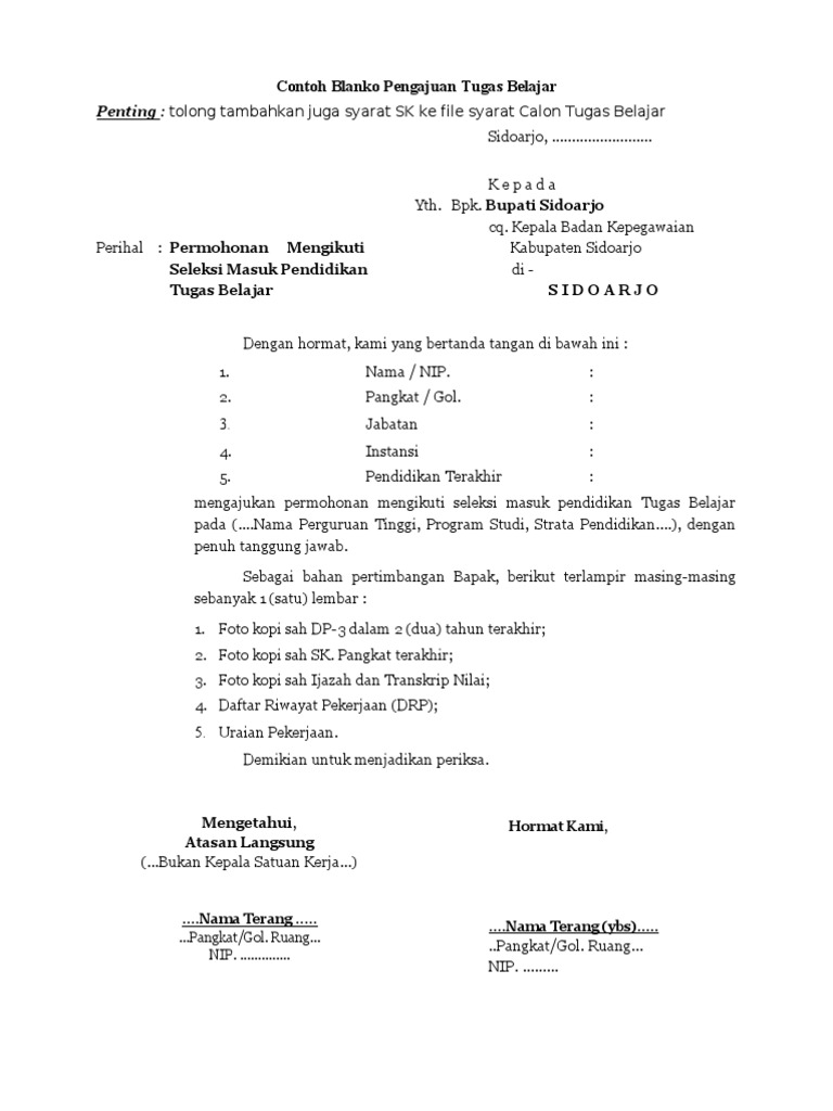 Studi pendidikan matematika dengan menggunakan biaya sendiri serta jadwal pelaksanaan kuliah yang tidak mengganggu tugas pokoksebagai pns di smpn 3 langensari. Dan jika anda melanggar peraturan kerja seperti sering terlambat masuk kantor ataupun sering absen tanpa pemberitahuan maka anda akan diberikan surat teguran oleh atasan anda. Contoh surat permohonan izin belajar contoh surat permohonan izin belajar bagi pns contoh surat permohonan izin belajar kepada atasan contoh surat permohonan izin belajar pns contoh surat permohonan izin belajar s1 contoh surat permohonan izin belajar s2. The collection that comprising chosen picture and the best amongst others. Format pengajuan ijin belajar dan tugas belajar silakan download disini. Pdf ok avandi surat mutasi pns ke instansi kablain surat permohonan pindah tugas pns guru resmi nehanesia contoh surat permohonan mutasi kerja contoh surat.