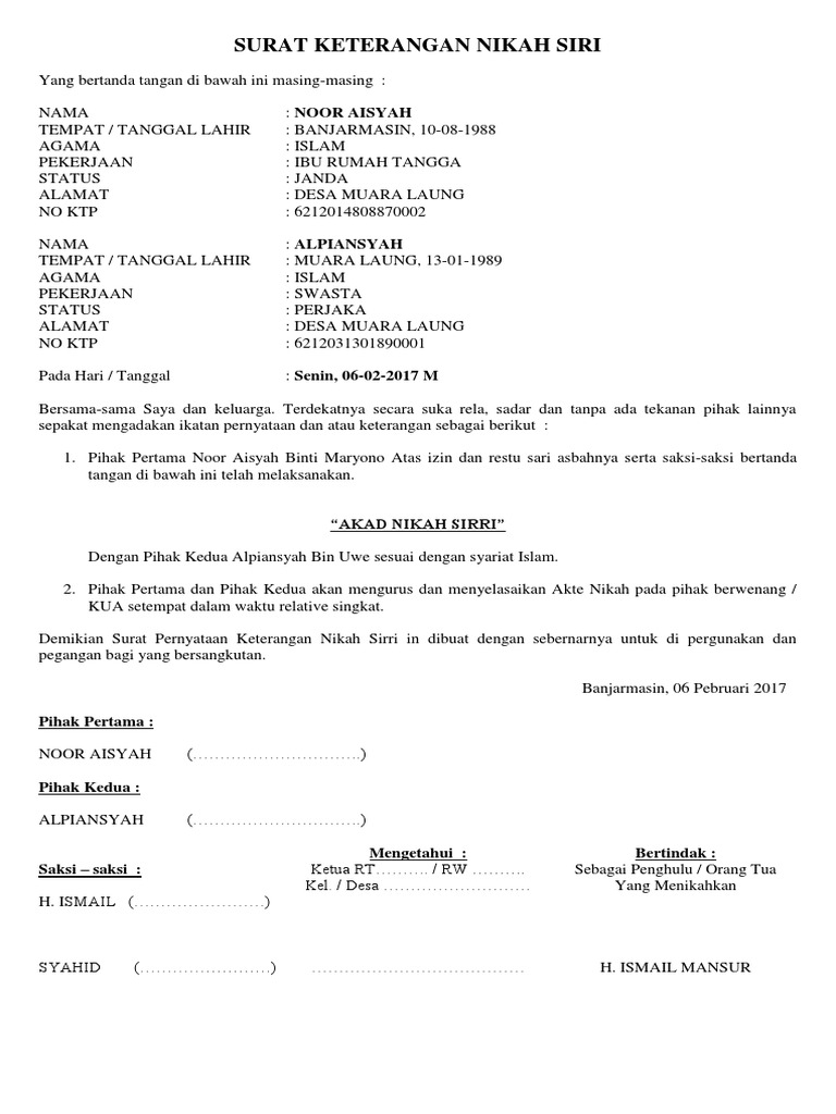 Contoh surat pernikahan siri. Pada surat pernyataan perkawinan sirih anda sudah harus membaca semua yang tertulis disana yang salah satu isinya jika dikemudian hari terdapat hal hal yang tidak di inginkan maka saya bersedia diproses secara hukum menurut undang undang yang berlaku. Namun apapun alasannya yang jelas nikah siri itu tidak akan dianggap ada oleh negara meskipun dari segi agama nikah siri sah sah saja. Contoh surat keterangan nikah siri dari desa have an image from the othercontoh surat keterangan nikah siri dari desa it also will feature a picture of a sort that may be observed in the gallery of contoh surat keterangan nikah siri dari desa. Untuk dapat mendownload contoh surat nikah siri dalam format doc silahkan anda klik link berikut ini. Download contoh surat nikah siri doc. Contoh surat nikah siri.