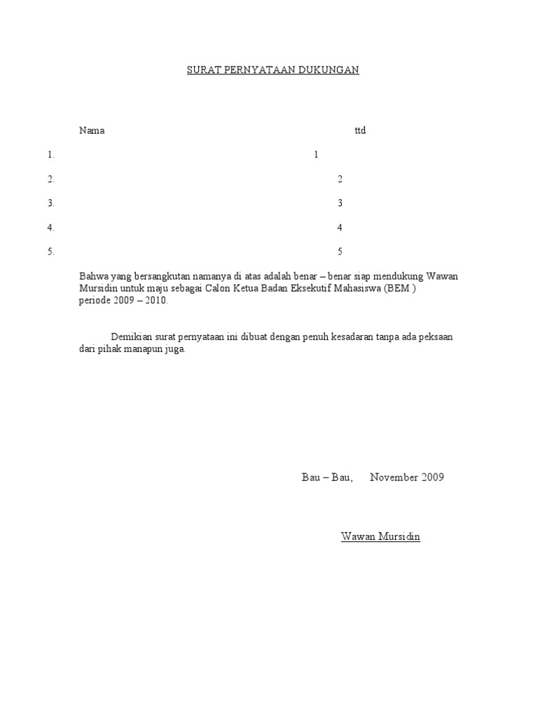 Calon ketua rw. Ini karena besarnya nominal nilai proyek yang tentu saja akan membutuhkan biaya pelaksanaan yang tidak bisa dibilang sedikit juga. Pernyataan dukungan surat pernyataan dukungan. Contoh surat dukungan distributor pada pelaksanaan sebuah pengadaan baik pengadaan barang jasa maupun konstruksi dibutuhkan surat dukungan sebagai salah satu nilai tambah. Contoh surat pernyataan dukungan contoh surat pernyataan dukungan. Contoh surat pernyataan sebuah surat pernyataan sering kali dipergunakan untuk berbagai keperluan baik di dunia kerja maupun untuk keperluan perjanjian lainnya.