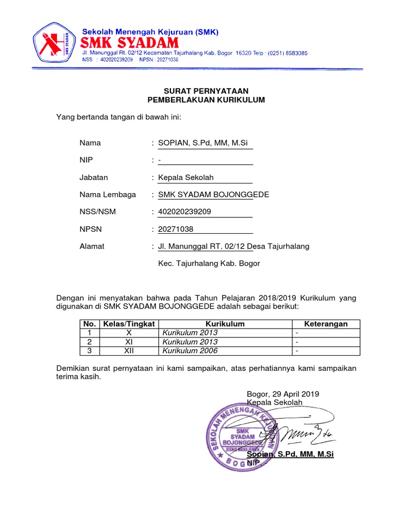 Surat pernyataan tentang pemberlakuan kurikulum 2013 thursday march 29 2018 add comment surat pernyataan tentang pemberlakuan kurikulum 2013 merupakan surat berisi pernyataan dari kepala sekolah bahwa pada tahun pelajaran tertentu sekolah yang dipimpinnya resmi menetapkan k 13 sebagai kurikulum yang digunakan dalam proses pembelajaran. Oleh karena itu pada posting ini admin akan mencoba memberikan contoh contoh surat pernyataan pemberlakuan kurikulum baik pada jenjang sdmi smpmts. Contoh surat keterangan pemberlakuan kurikulum ktsp. Itulah surat pernyataan pemberlakuan kurikulum ktsp dan k13 yang dapat admin kumpulkan. Peserta didik siswa jenjang sdmi smpmts smama smkmak sudah melaksanakan usbn un ukkpat kegiatan belajar mengajar akan segara berakhir dengan demikian kepala sekolah perlu membuat penetapan kurikulum untuk tahun ajaran baru. Menyatakan dan menetapkan untuk memberlakukan kurikulum tingkat satuan ktsp tahun pelajaran 20142015.