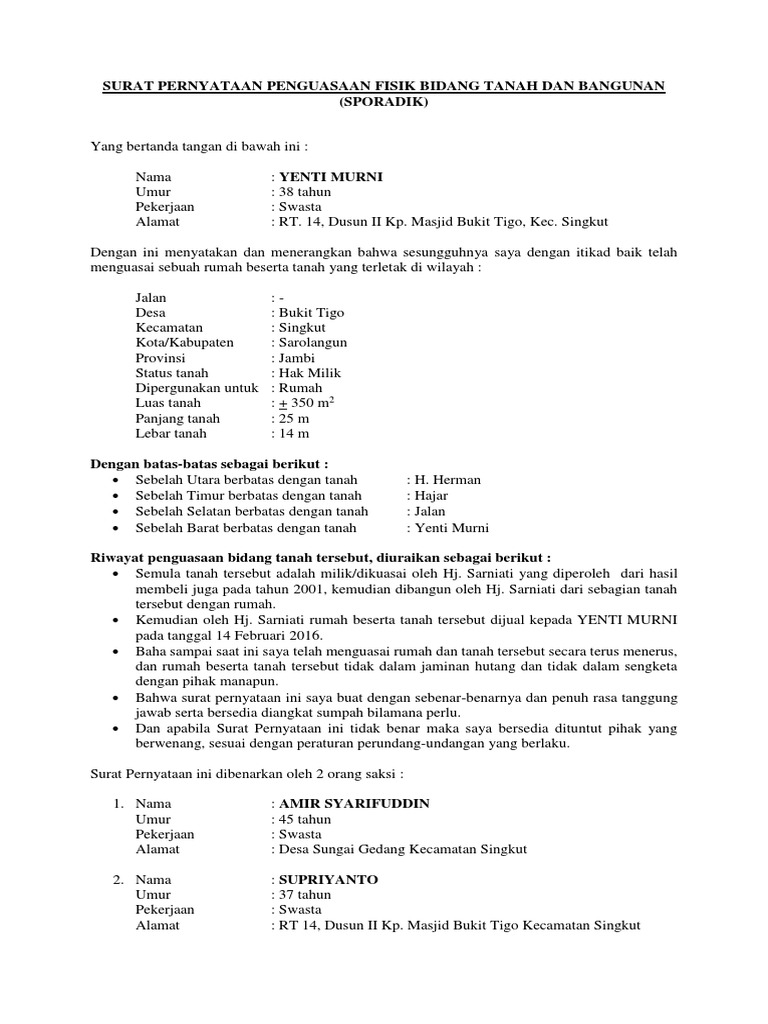 Contoh format surat pernyataan penguasaan fisik bidang tanah surat pernyataan peguasaan fisik bidang tanah yang bertanda tangan di bawah ini lurah mokoau yang dikuatkan saksi saksi yang tertera di bawah ini menerangkan dengan sesungguhnya bahwa. Surat ini juga menjadi bukti bahwa kedua belah pihak yaitu penjual dan pembeli tanah sepakat untuk melakukan transaksi secara sah. Kali ini kami hadir lagi dengan memberikan contoh surat pernyataan penguasaan fisik bidang tanah surat ini merupakan surat pernyataan dari seseorang yang memiliki sebidang tanah. Selanjutnya di sebut sebagai pihak pertama atau pihak yang mengalihkan penguasaan tanah kepada. Kali ini kami hadir lagi dengan memberikan contoh surat pernyataan penguasaan fisik bidang tanahsurat ini merupakan surat pernyataan dari seseorang yang memiliki sebidang tanah. Contoh surat pernyataan jual beli tanah.