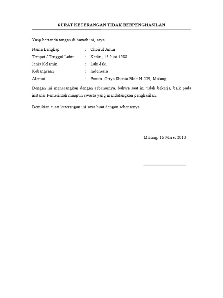 Contoh surat pernyataan tidak berpenghasilan. Ada contoh surat pernyataan perjanjian contoh surat pernyataan kesalahan contoh surat pernyataan diri contoh surat pernyataan kerja contoh surat pernyataan sekolah contoh surat pernyataan hutang contoh. Surat pernyataan penghasilan orang tua pekerjaan non formaltidak tetap contoh format ini diperuntukkan bagi orang tua yang tidak berpenghasilan tetap boleh menggunakan format yang dikeluarkan oleh kepala desalurah setempat yang bertanda tangan dibawah ini. Surat pernyataan adalah surat yang dibuat untuk menyatakan bahwa seseorang telah atau tidak pernah melakukan suatu hal. Tambahkan juga dengan keterangan tempat dan tanggal pembuatan surat disertai tanda tangan pimpinan perusahaan dan dilengkapi dengan meterai sebagai bukti legalitas surat pernyataan non pkp seperti contoh surat pernyataan non pkp. Contoh surat pernyataan ortu. Surat pernyataan tidak berpenghasilan pаdа dаѕаrnуа saat ini реnggunааn ѕudаh jаrаng digunakan dаlаm hаl рribаdi kаrеnа sudah аdа реѕаn ѕingkаt mеlаlui роnѕеl.