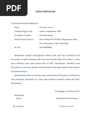 Menyatakan bahwa berdasarkan hasil pemeriksaan dokter saat ini saya tidak dalam keadaan hamil dan bersedia untuk tidak hamil sampai saat melaksanakan tugas sebagai tkhi ppih. N a m a. Contoh surat pernyataan sebuah surat pernyataan sering kali dipergunakan untuk berbagai keperluan baik di dunia kerja maupun untuk keperluan perjanjian lainnya. Pernyataan ini saya buat dengan penuh kesadaran dan tanpa paksaan atau tekanan. Contoh surat pernyataan tidak akan menikah selama 1 tahun untuk melamar kerja setiap instansi atau lembaga mempunyai syarat tertentu dalam merekrut karyawan baru salah satunya meminta kepada calon karyawan atau yang hendak mendaftar untuk menjadi karyawan untuk melampirkan surat pernyatan tidak akan menikah selama satu tahun jika diterima bekerja di instansi atau lembaga tersebut. Namun untuk urusan komunikasi perusahaan maupun berbagai lembaga maupun instansi pemerintah penggunaan surat masih merupakan sesuatu hal yang wajib untuk dilakoni.