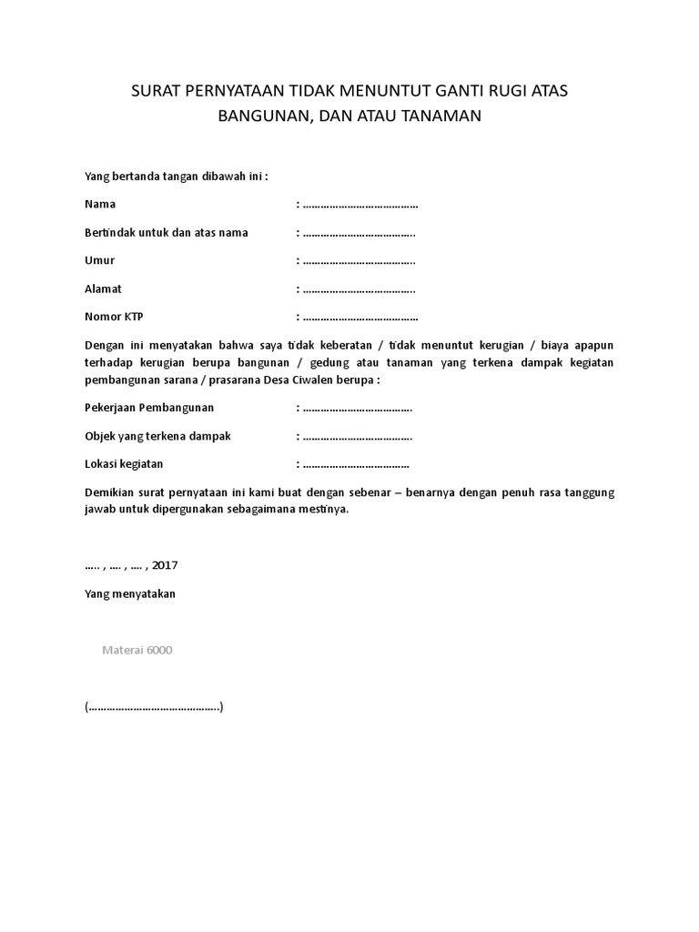 Contoh surat pernyataan tidak menuntut ganti rugi. Selain contoh ganti rugi yang berhubungan dengan sewa rumah dan kecelakaan surat pernyataan bersedia membayar ganti rugi dibawah ini bisa dimodifikasi untuk mengganti kerugian yang diakibatkan misalnya. 2 resep masakan daerah 2 menelusuri peradaban awal di kepulauan indonesia 1 bahasa inggris 1 contoh proposal 1 contoh surat pengunduran diri 1. Inilah pembahasan selengkapnya mengenai surat pernyataan tidak menuntut ganti rugi kecelakaan. Contoh surat pernyataan tidak menuntut adalah gambar contoh surat berdefinisi tinggi dan memiliki ukuran 1700x2200. Tidak akan menuntut ganti rugi dalam bentuk apapun kepada panitia pelaksanaan pekerjaan satker bpks apabila dalam proses pelelangan dan pelaksanaan pekerjaan adanya kebijakan pemerintah republik indonesia tentang perubahan perubahan atau pergeseran alokasi biaya tahun anggaran 2017 atau adanya hal yang tidak memungkinkan untuk dilanjutkan pelelangan ataupun pekerjaan yang sedang berjalan. Contoh surat pernyataan tidak menuntut.