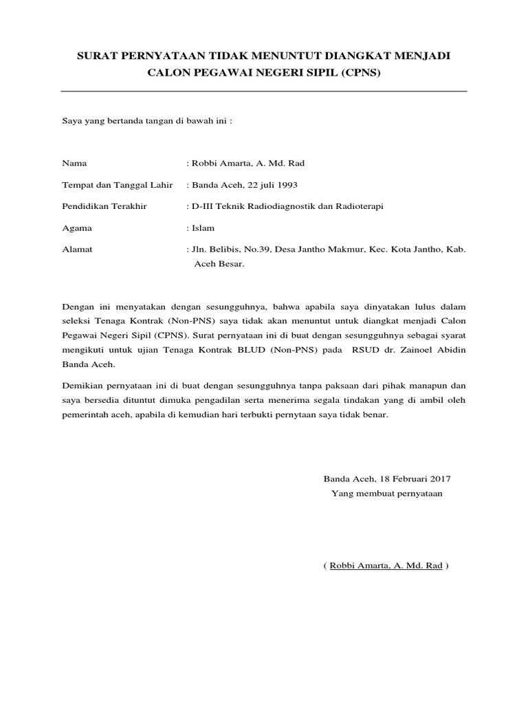 Contoh surat pernyataan tidak menuntut pns. Anda dapat melihat dengan jelas contoh surat pernyataan tidak menuntut pns menggunakan desktop anda tablet android atau iphone dan perangkat smartphone lainnya secara gratis. Surat pernyataan tidak menuntut penyetaraan pangkat dan golongan 9. Contoh surat pernyataan cpns 2017 resmi menpan lulusan sma smk d3 d4 s1 s2 semua jurusan bank bumn cpns 2018 daerah provinsi kementerian cpns 2018. Selain dalam hal transaksi surat pernyataan juga diperlukan dalam masalah pekerjaan salah satunya adalah pengajuan cpns. Contoh surat pernyataan tidak menuntut. Contoh surat pernyataan jabatan ketika anda diterima menjadi salah satu karyawan di salah satu perusahaan dan ditempatkan pada satu posisi tertentu terlebih dahulu anda akan dimintai pernyataan kesanggupan atas tanggung jawab dari posisi ataupun pekerjaan yang anda emban.
