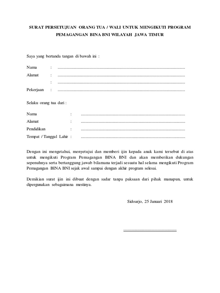 Contoh surat persetujuan dari orang tua. Surat persetujuan dari orang tua untuk pekerjaan. Anda bisa menggunakan contoh surat pernyataan orang tua untuk melamar tni di bawah ini. 13 contoh surat pernyataan izin orang tua untuk berbagai keperluan. 15 contoh surat izin orang tua untuk berbagai keperluan penggunaan surat memang tidak akan pernah ada habisnya. Seringkali orang tua wajib menyerahkan surat persetujuan kepada instansi pendidikan sebagai bukti bahwa mereka tidak berkeberatan dan mengizinkan putra atau putri mereka melanjutkan studi di instantsi tersebut. Makalahid pada dasarnya contoh surat pernyataan orang tua tidak jauh berbeda dengan surat pernyataan pada umumnyaadapun mengenai pengertian dari surat pernyataan adalah sebuah surat yang dibuat oleh seseorang dimana di dalam surat tersebut berisi sebuah pernyataan yang menunjukkan bahwa dirinya atau juga orang lain bersedia atau pernah melakukan sesuatu sebagaimana yang telah dituangkan.