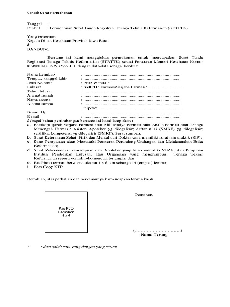 Setiap tenaga kefarmasian yang menjalankan pekerjaan kefarmasian wajib memiliki surat tanda registrasi surat tanda registrasi sebagaimana dimaksud adalah surat tanda registrasi tenaga teknis kefarmasian strttk bagi tenaga teknis kefarmasian. Namun pada umumnya dinas keshatan akan meminta surat rekomendasi dari pafi buat kita yang ingin mengurus strttk. Data data mengenai contoh surat rekomendasi apoteker untuk asisten apoteker. Anda ingin perpanjang sikttkstrttk. Permohonan surat tanda registrasi tenaga teknis kefarmasian strttk yang terhormat kepala dinas kesehatan provinsi jawa timur di tempat bersama ini kami mengajukan permohonan untuk mendapatkan surat tanda registrasi tenaga teknis kefarmasian strttk sesuai peraturan menteri kesehatan nomor 889menkesperv2011 tentang registrasi izin praktik dan izin kerja. Surabaya 13 april 2017 hal.