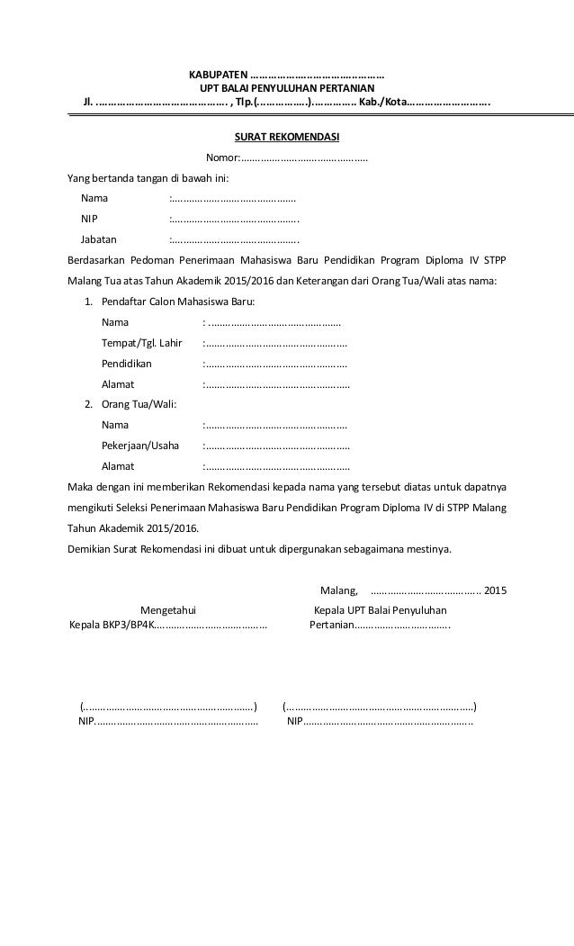 Contoh Rekomendasi Calon Mahasiswa Baru Stpp Malang 2015