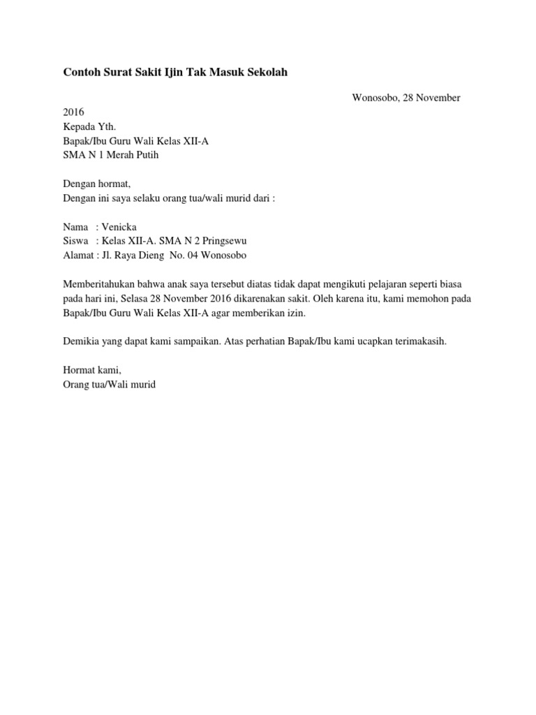Surat izin tersebut tidak harus diketik menggunakan komputer. Dan jika ada yang melanggar dari peraturan maka tentu saja pihak sekolah juga sudah menyiapkan. 34 jalan mohd salleh lorong abdullah 85000 muar johor bahru johor. Seorang siswa sma pastinya sudah biasa untuk membuat surat izin sekolah. Contoh surat tidak hadir ke sekolah yang kami kongsikan ini boleh anda jadikan rujukan in case anak anda ada urusan penting sehingga ketidakhadirannya ke sekolah pada hari tersebut. Peraturan tersebut bukan hanya berlaku untuk para siswa namun juga untuk para guru staff dan para pegawai yang ada pada sekolah tersebut.