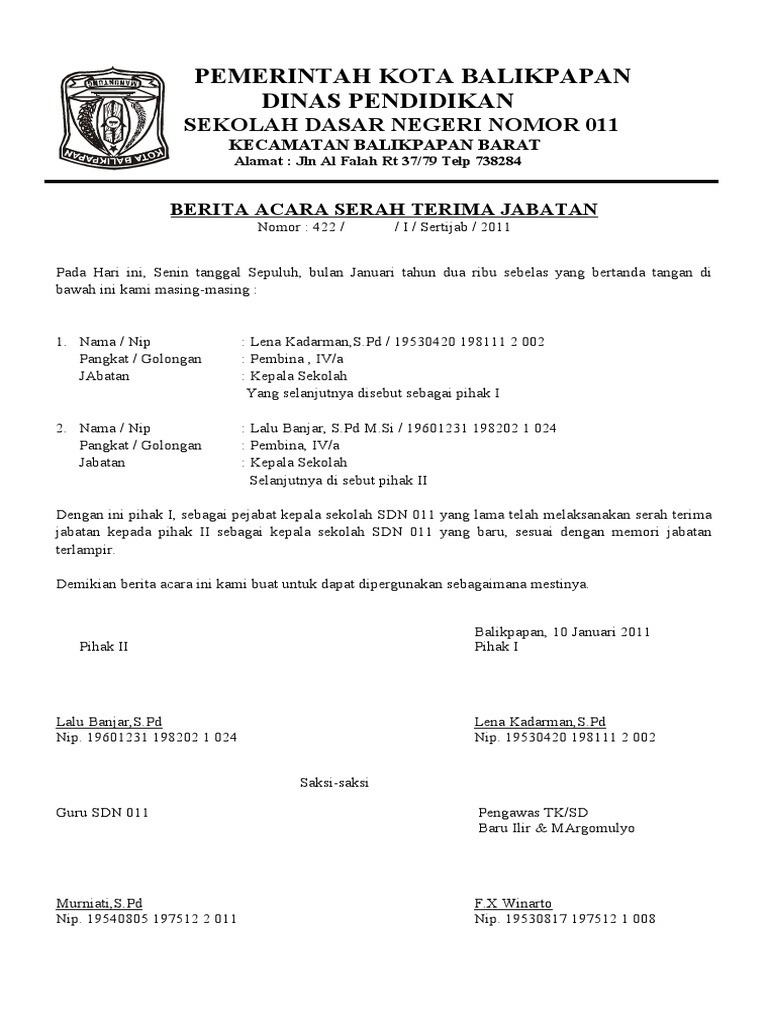 Berita acara serah terima jabatan kepala sekolah dasar negeri purworejo 02 unit pelaksana teknis dinas pendidikan. Biasanya terima jabatan ini terjadi karena adanya pergantian jabatan dari satu pihak kepada pihak yang lain.