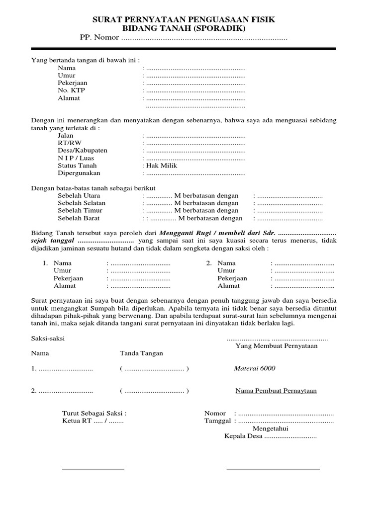 Surat pernyataan penguasaan fisik bidang tanah sporadik memang salah satu produk yang dikeluarkan oleh desa atau kelurahan yaitu dengan membubuhkan tanda tangan kepala desalurah di suratnya serta mencatatkan di buku register kelurahan. Apakah boleh kepala desa mebuat sporadik tanah dan seperti apa kekuatan hukumnya. Perlu adanya surat ini karena pemilik tersebut belum memiliki sertifikat tanah. Kali ini kami hadir lagi dengan memberikan contoh surat pernyataan penguasaan fisik bidang tanahsurat ini merupakan surat pernyataan dari seseorang yang memiliki sebidang tanah. Contoh surat sporadik dan surat surat dinas surat dinas model surat sporadik surat tanah pelepasan hak. Contoh format sporadik surat pernyataan fisik bidang tanah docx download gratis.