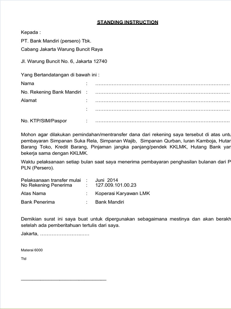 Standing instruction no surat. Account numbernombor akaun to be debiteduntuk didebit 2. Sila tanda yang mana berkenaan stamp setem 1. Bpzis at bankmandiricoid sebelum diserahkan ke bank mandiri. The manager citibank n a chennai i hereby authorise you to debit my savingscurrent account no. Berikut ini merupakan contoh pembuatan surat standing instructin si sebagai syarat sah dalam proses pemindah bukuan danatau pencairan dana bos.