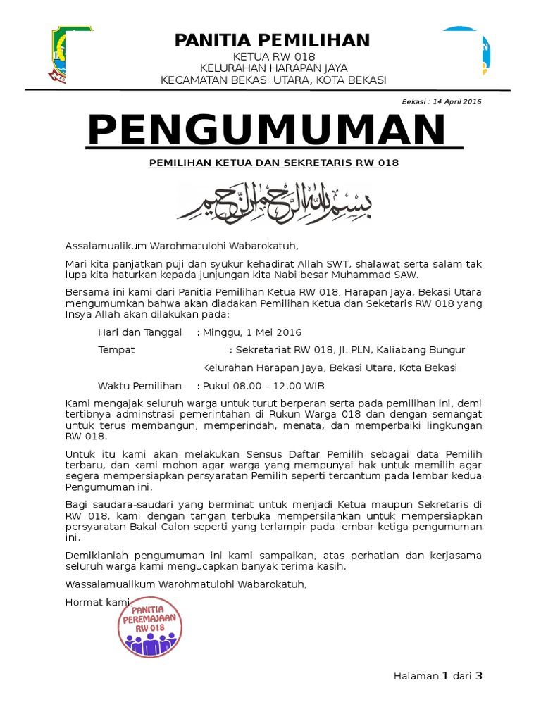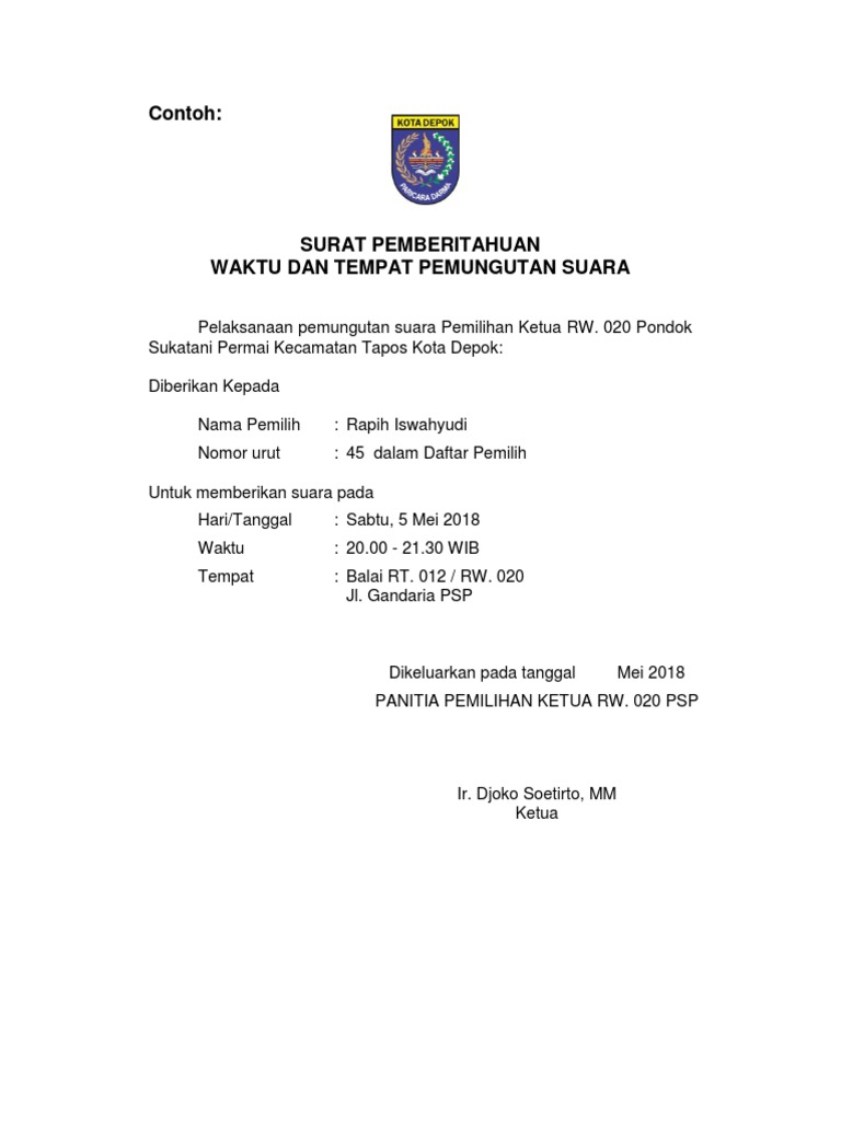 Contoh surat tugas pengawas pemilihan letua rw. Mari sukseskan pemilihan ketua rw 15 di puri nirwana 3 tercinta ini. Ini adalah contoh sementara surat suara pemilihan ketua rw 15. Contoh surat suara pemilihan rt. Apabila ada 2 calon yang mempunyai suara yang sama maka akan ada pemilihan tahap kedua untuk menentukan suara terbanyak14. Yang bertanda tangan di bawah ini.