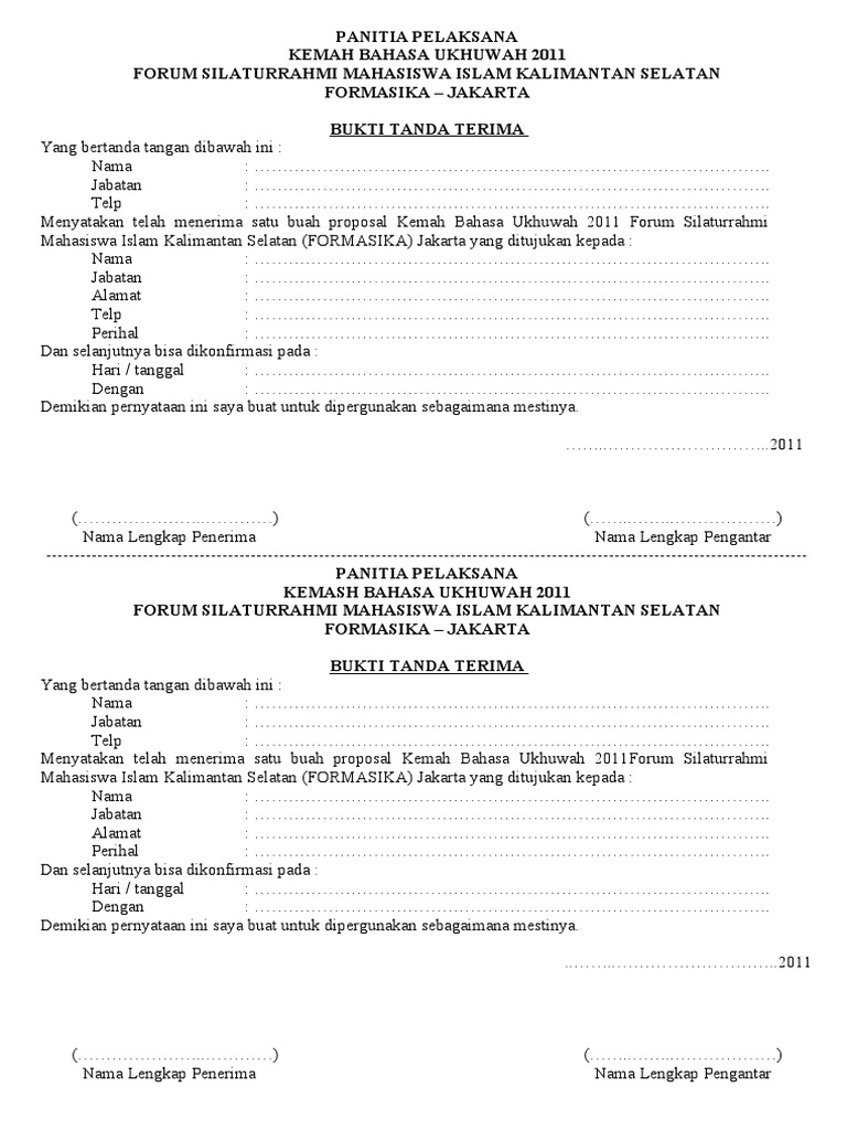 Contoh tanda terima proposal resmi yaitu tanda terima tawaran yang menyertakan kop surat dan ditanda tangani oleh kedua belah pihak baik yang membawa tawaran maupun yang mendapatkan tawaran tersebut berikut contohnya. Dengan mengetahui namanya tentu anda sudah bisa menebak bahwa di dalam surat ini nantinya berhubungan dengan barang yang dikirim dan diterima oleh seseorang yang melakukan transaksi pengiriman barangbiasanya surat ini akan diselipkan atau dibawakan kepada seseorang yang bertugas untuk mengirimkan barang tersebut. Contoh surat tanda terima proposal contoh pembuatan surat dan dokumen. Perhatikan penulisan dengan baik agar dokumen yang anda buat dapat diterima. Segera urus dokumen anda. Nah itu tadi penjelasan singkat mengenai contoh surat tanda terima.
