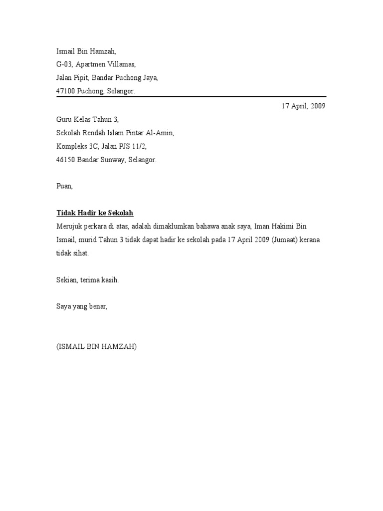Surat rasmi memohon cuti sekolah ini penting untuk memastikan rekod berhenti sekolah kelak pelajar yang baik dan tiada mempunyai rekod kesalahan. Berikut dikongsikan contoh yang mudah dan ringkas beberapa surat rasmi makluman kepada pihak sekolah akan ketidakhadiran pelajar ke sekolah tanpa sijil sakit ataupun atas alasan lain yang kukuh atau munasabah. Ini kerana urusan menghantar surat kepada guru kelas adalah dikira sebagai urusan rasmi. Surat tidak hadir ke sekolah urusan keluarga unit a 1 10 blok b apartment seri berlian petaling jaya selangor.