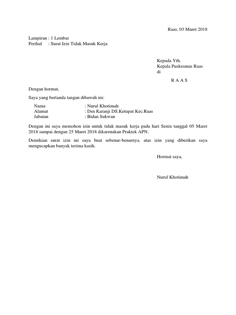 Surat izin tidak masuk kerja adalah surat yang diajukan oleh seorang karyawan kepada pihak perusahaan atau instansi tempatnya bekerja untuk memohon izin tidak bekerja untuk sementara waktu. Bersama surat ini bermaksud mengajukan permohonan izin untuk tidak masuk kerja selama 3 hari mulai hari ini sampai tanggal 23 januari 2020 karena sakit. Contoh surat izin sakit pembahasan materi kali ini adalah mengenai cara membuat dan contoh surat izin sakit tidak masuk sekolah kerja dan kuliah. Permohonan izin ini saya ajukan karena sesuai dengan hasil pemeriksaan yang tertera pada surat keterangan dokter saya lampirkan saya harus menjalani istirahat selama 3 hari. Contoh surat izin tidak masuk kerja bagi setiap pekerja pasti ada saat yang mengharuskan kita bisa tidak masuk kerja alias iijin tidak masuk kerja. Contoh surat teguran tertulis bagi pns yang tidak masuk kerja ada banyak.