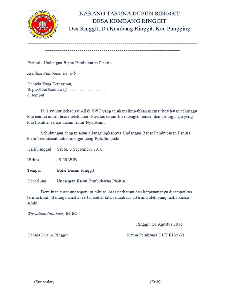 Semoga contoh undangan di atas bermanfaat dan apabila masih belum jelas silahkan dipertanyakan pada kolom komentar sekian dan terimakasih. Contoh surat undangan rapat karang taruna desa acara 17 agustus surat undangan dengan tujuan rapat karang taruna merupakan salah satu surat resmi karena pada surat undangan rapat terdapat ada kepala surat dan berstempel organisasi.