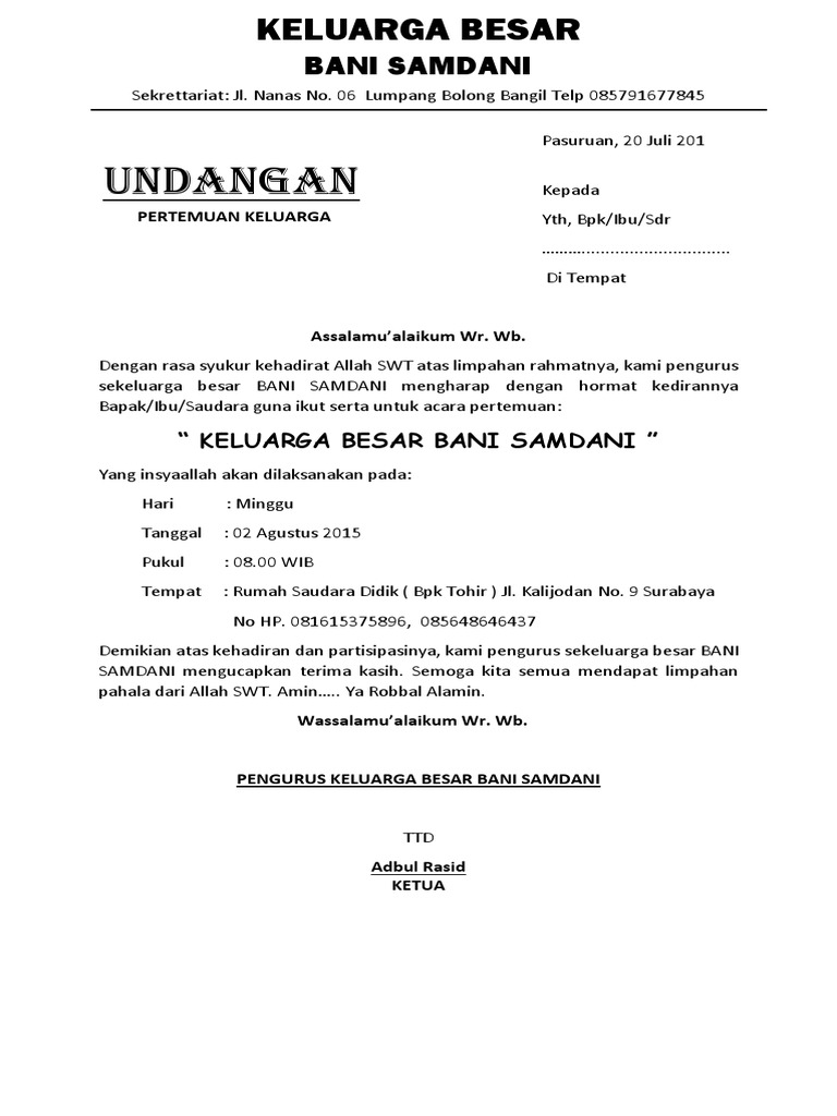 Contoh surat undangan kita tahu surat undangan adalah sebuah tulisan di dalam kertas yang memuat ajakan kepada orang lain baik perorangan maupun kelompok untuk menghadiri kegiatan tertentu. Keduanya memiliki karakteristik yang berbeda dan digunakan untuk keperluan yang tidak sama. Tuesday 20th november 2018 0717. Contoh surat undangan arisan rt ini yang saat ini kamu cari cari karena kami menyampaikan ini untuk anda semua dan pastinya ini sangat bermanfaat kepada anda semua dan ini adalah format undangan arisan rt yang memang dibikin sangat simpel sekali sehingga saat anda ingin membuat sangat mudah sekali atau anda bisa mencontoh langsung surat undangan arisan rt yang ada di bawah ini yang mana. Demikianlah posting singkat saya tentang contoh surat undangan rapat rt. Contoh surat undangan pemilihan rt have an image from the othercontoh surat undangan pemilihan rt it also will include a picture of a kind that may be seen in the gallery of contoh surat undangan pemilihan rt.
