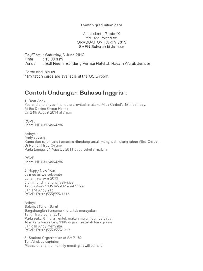Contoh surat undangan kelulusan dalam bahasa inggris. Contoh surat undangan kelulusan sekolah dalam bahasa inggris informasi ini adalah contoh surat undangan kelulusan sekolah dalam bahasa inggris yang bisa anda download secara gratis di website kami. Namun bagaimana dengan surat dalam bahasa inggris. Jika kita mengadakan sebuah kegiatan formal dan ingin mengundang seseorang atau bahkan institusi dalam bahasa inggris. Undangan merupakan salah satu jenis surat yang paling sering ditemui. Apakah sahabat sbi juga sudah pernah membaca nya. 4 contoh surat undangan rapat dalam bahasa inggris undangan biasanya kita dapatkan apabila seseorang mengadakan suatu acara dan kita diharapkan untuk datang ke acara tersebut.