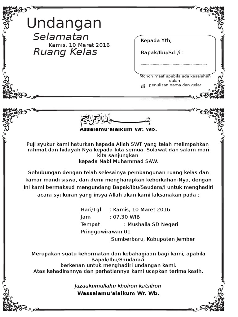 Contoh surat undangan selamatan. Model undangan seri 3bdoc. Contoh surat undangan syukuran pernikahan ini dibutuhkan untu acara syukuran atau yasinan untuk acara pernikahan. Contoh surat undangan syukuran kalau kita membuat udangan syukuran anak kita maka anda harus melakukan dengan cara ini dimana kamu bisa mengetahui tentang bagimana untuk membuat contoh undangan syukuran yang benar dan sesuai dengan undangan yang lainya. Model undangan seri 2b turun tanahdoc. Tahlil adalah salah satu tradisi yang sangat lekat di masyarakat muslim di indonesia. Nah contoh surat undangan selamatan rumah baru di atas hanya menggambarkan kata kata dalam undangannya jika anda membutuhkan formatnya dengan border kami sudah membuatnya dalam format word.